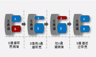 高優(yōu)先級通道可借用其他低優(yōu)先級通道帶寬,如低優(yōu)先級通道擁堵,則將借用帶寬返還,無需人工干預(yù),實(shí)現(xiàn)流量動(dòng)態(tài)調(diào)配。同時(shí)建立“線路”策略,“通道策略”可調(diào)用“線路策略”,并且多個(gè)“通道策略”可配置在同一“線路策略下”,通道策略之間可以動(dòng)態(tài)借用帶寬,讓帶寬充分利用。