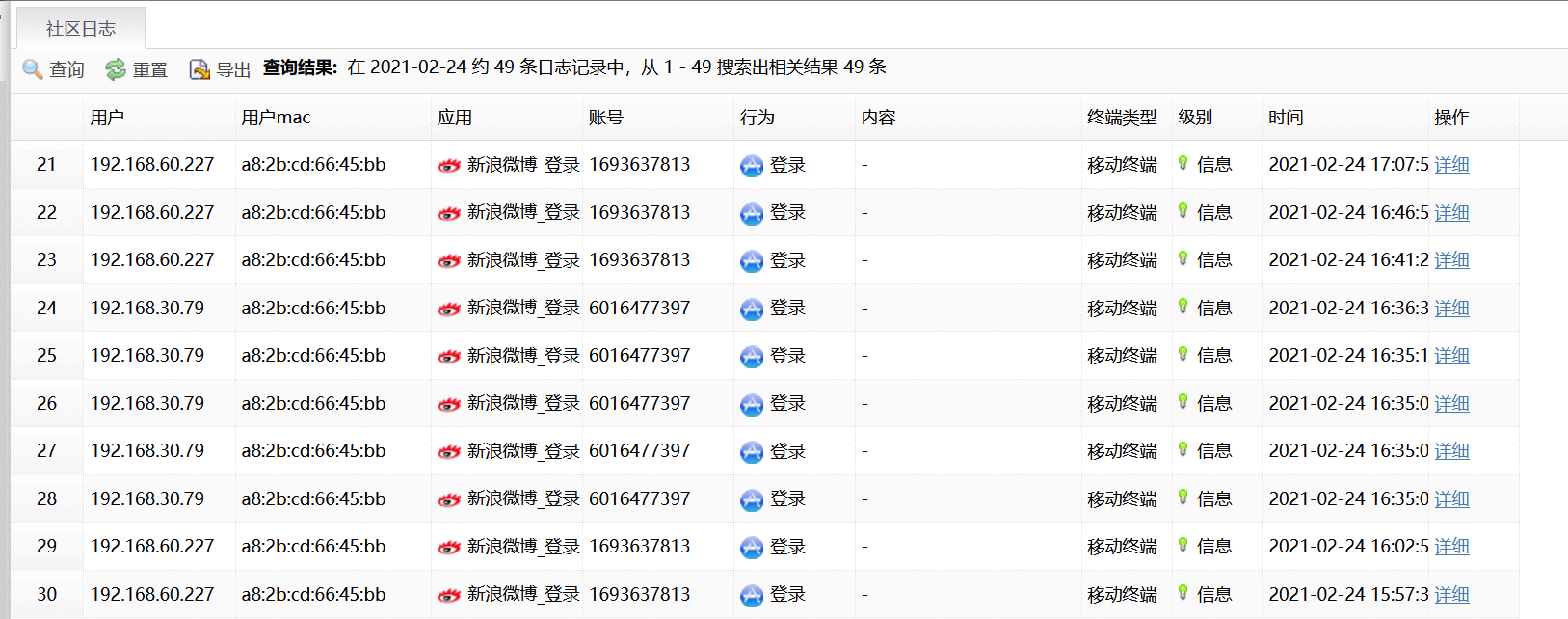 可記錄發(fā)貼用戶的源地址、目的地址、發(fā)貼網(wǎng)站、發(fā)貼時(shí)間和具體發(fā)貼內(nèi)容,網(wǎng)頁發(fā)帖支持對特定時(shí)間、特定關(guān)鍵字的查詢功能。通過管理員賬戶登錄后,可以查看到網(wǎng)頁發(fā)貼的具體內(nèi)容,如下圖所示: