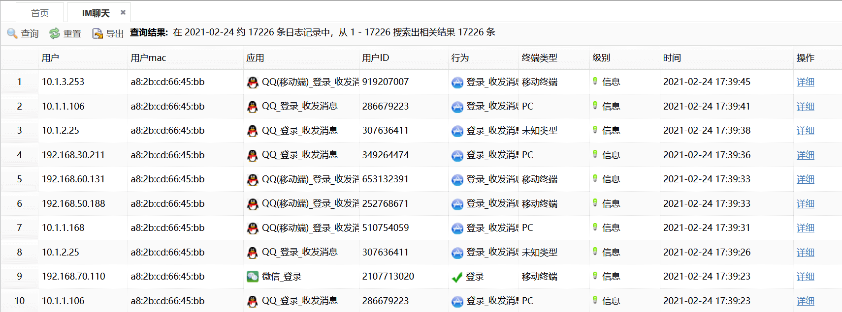 可記錄及時(shí)通訊如QQ、微信等聊天軟件的相關(guān)信息,對于非加密MSN聊天,可記錄聊天詳細(xì)內(nèi)容。通過登錄管理員用戶,可以查看QQ即微信的登錄發(fā)送文件類型等。如下圖所示: