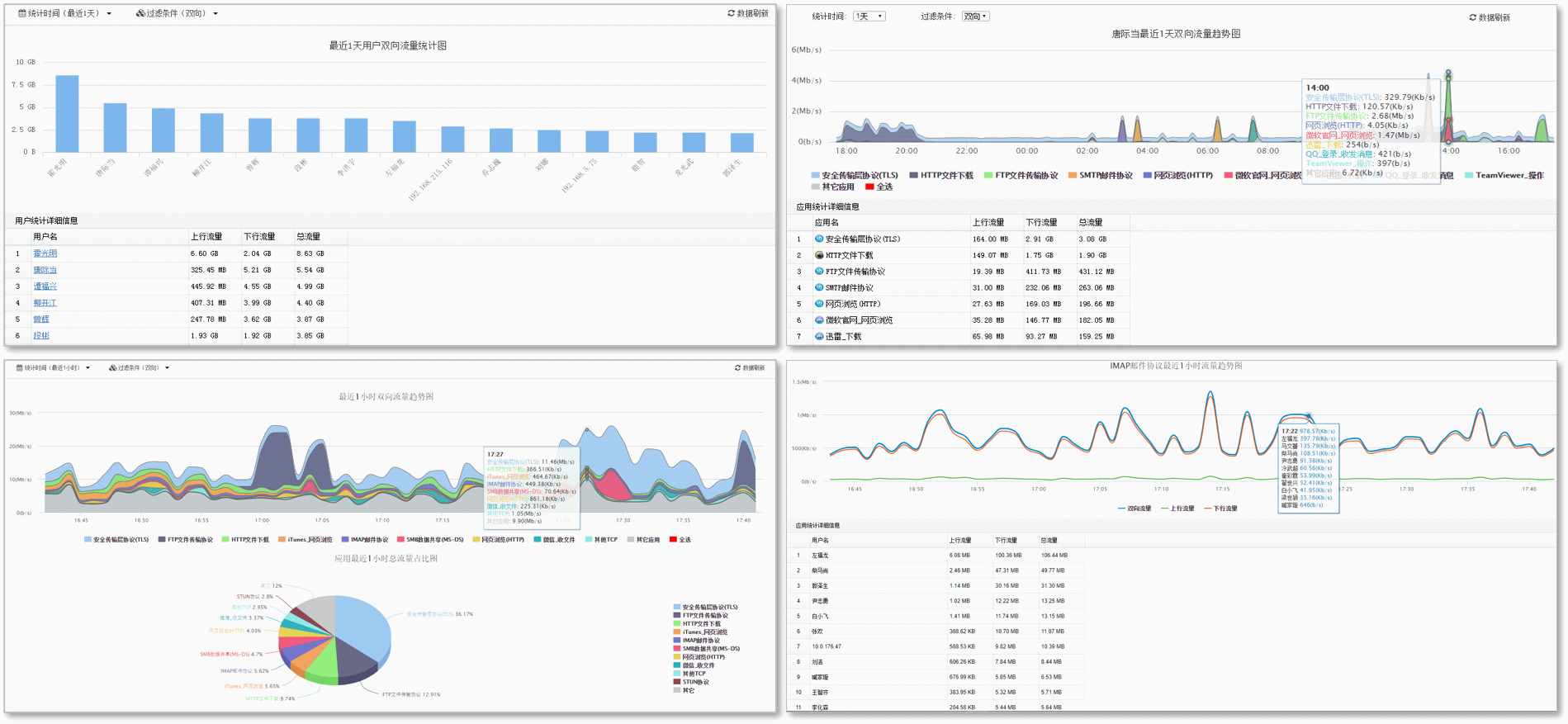 AZ6000的帶寬管理功能模塊可提供最大帶寬、保證帶寬、其中可對、連接帶寬等多種帶寬管理手段,并提供基于用戶、應(yīng)用、時(shí)間、網(wǎng)絡(luò)接口等多種組合條件的帶寬管理策略,滿足網(wǎng)絡(luò)管理者對用戶及應(yīng)用帶寬管理策略的靈活性要求。此外,通過歷史流量分析功能模塊,借助圖形化的數(shù)據(jù)和報(bào)表,用戶可以直觀的查看到各種應(yīng)用占用帶寬資源的情況。通過對網(wǎng)絡(luò)歷史流量的深入分析,管理者可以制定出最適合自身的互聯(lián)網(wǎng)流量管理策略。