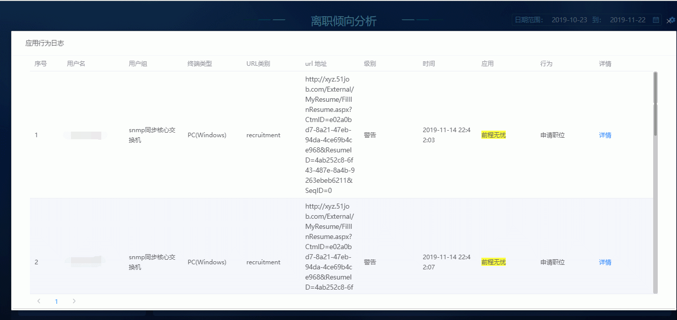 通過對員工上網(wǎng)行為審計(jì)日志的分析,對員工上網(wǎng)行為數(shù)據(jù)進(jìn)行深度挖掘,就其上網(wǎng)行為進(jìn)行用戶畫像,可做工作效率分析、離職傾向分析等,如掌握公司員工動(dòng)態(tài),針對HR有助于對員工離職信息做分析,反饋給公司管理層,進(jìn)行制度調(diào)優(yōu)等,還可通過員工工作效率分析,適當(dāng)調(diào)整工作量等,讓管理更合理。