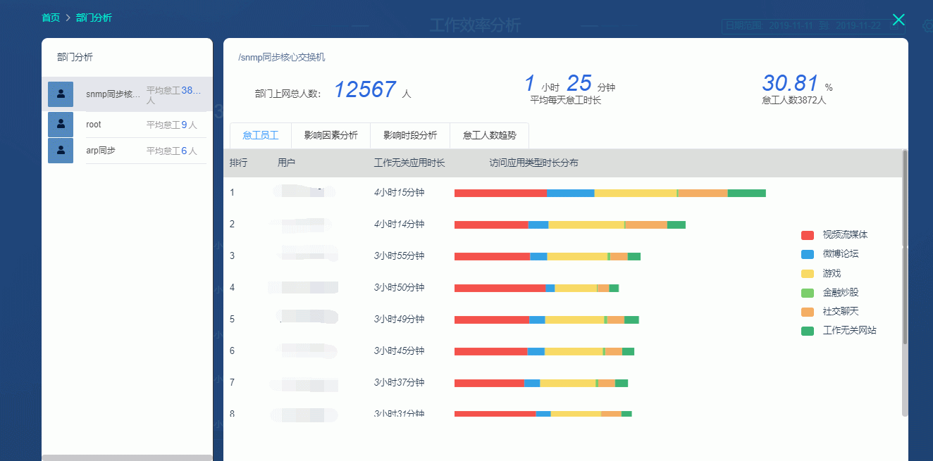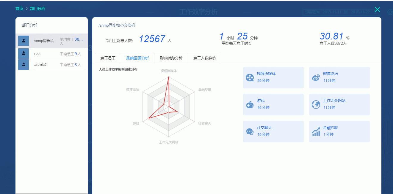 通過用戶畫像,追溯員工上網(wǎng)軌跡,建立上網(wǎng)模型,整個(gè)過程中通過分析給不同員工打上不同的標(biāo)簽進(jìn)行區(qū)分,可以感知員工工作飽和度,對員工上網(wǎng)數(shù)據(jù)進(jìn)行深度發(fā)掘,如公司HR可感知員工離職傾向,優(yōu)化公司管理制度等提供輔助依據(jù)。